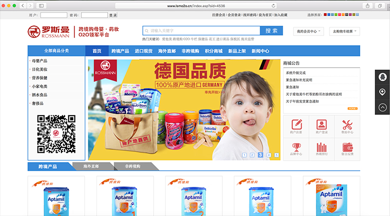 2015年11月,“罗斯曼”正式签约知变系统,成为我们的O2O电商系统用户!罗斯曼是入驻在宁波跨境口岸的一家跨境电商公司,主营奶粉、孕婴、药妆等产品,销售渠道为网购+部署加盟实体店,整套业务运营需完全依赖知变电商系统。